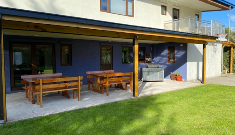El jardín de la casa es completamente plano y formado, diseñado para entretención, con un pasto denso y resistente para juego, un muro de hormigón construido para pelotear, y un área de juego para básquetbol.
